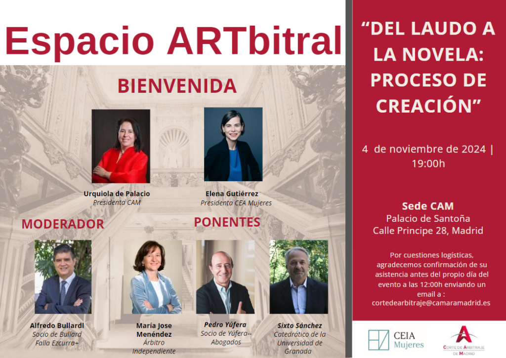 ¡Desde la Corte de Arbitraje de Madrid , os invitamos a una nueva sesión del Espacio ARTbitral! Como sabéis, el Espacio ARTbitral es una iniciativa creada el año pasado desde la Corte en colaboración con CEIA Mujeres y con Cecilia O’Neill de la Fuente como promotora y motor de la idea. El Espacio ARTbitral nació […]